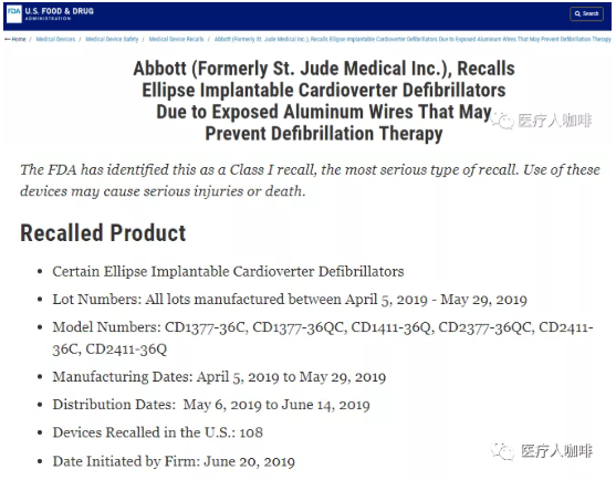 8月5日,F(xiàn)DA 發(fā)布醫(yī)療器械一級召回事件公告,將雅培圣猶達公司召回 Ellipse 植入型心律轉復除顫器(ICD)視為一級召回,一級是最嚴重的召回類型,因為可能導致嚴重傷害或患者死亡。