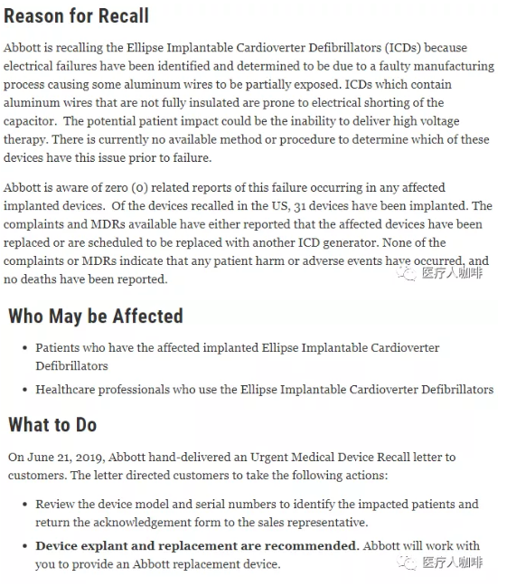 雅培于 6 月 21 日向客戶發(fā)送了緊急醫(yī)療設備召回函,要求檢查設備型號和序列號以識別受影響的患者并將確認表返回給銷售代表,并建議進行設備分離和更換,雅培提供更換設備。