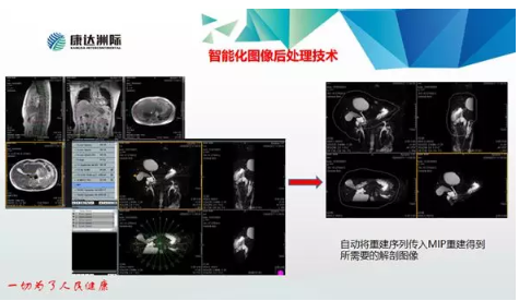 康達(dá)“智速”磁共振采用的智能化圖像后處理技術(shù)無需人工干預(yù),自動將重建序列傳入MIP重建得到所需要的解剖圖像。在AI技術(shù)助力下,能完成五期動態(tài)增強(qiáng),單期掃描時間僅需15秒。