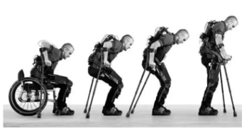 2010年,伯克利仿生研究所研制出的一種由電池提供動(dòng)力的機(jī)械骨骼系統(tǒng)“eLEGS“。這是世界上第一款不使用繩或鏈達(dá)到自然行走目標(biāo)的外骨骼,使用者通過(guò)手臂姿勢(shì)控制,向前移動(dòng)右拐杖,則左腿隨之向前移動(dòng),幫助截癱患者擺脫輪椅以自然步態(tài)行走。