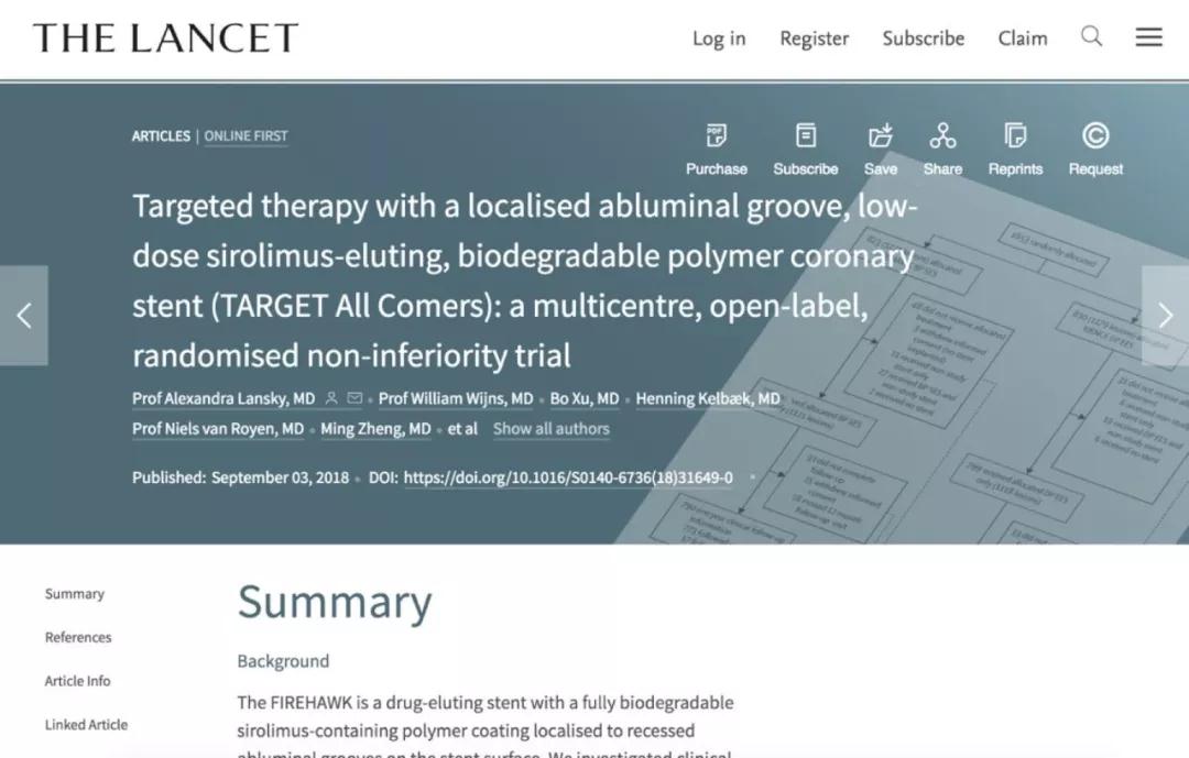 最終的試驗(yàn)結(jié)果證明中國(guó)醫(yī)療器械此行確實(shí)底氣十足?;瘊椬鳛榈谌邢蛩幬锵疵撝Ъ?,證明了患者植入后,受到治療的血管區(qū)域能夠在早期快速愈合,因?yàn)槠鋭?chuàng)新性的微槽包裹藥物、生物可降解聚合物的設(shè)計(jì),以及較低的載藥量(僅需同類(lèi)產(chǎn)品三分之一的載藥量即可實(shí)現(xiàn)同等療效),安全性大幅增加,可有效減少晚期血栓事件的發(fā)生,達(dá)到了世界頂尖水平。如今,這些結(jié)論登上了《柳葉刀》,中國(guó)智造的“吶喊”迅速在全球醫(yī)學(xué)界傳播開(kāi)來(lái)。