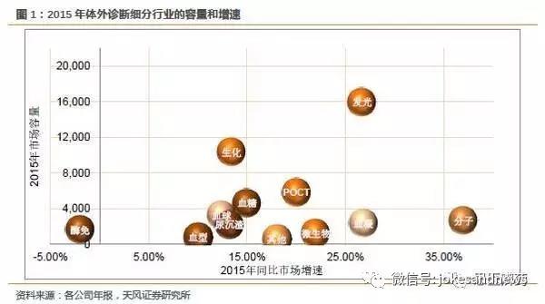 由上圖看出,從市場容量和行業(yè)增速兩個維度來看,化學發(fā)光細分具有良好的投資價值潛質(zhì)。2015年化學發(fā)光市場容量160億,占整個體外診斷行業(yè)30%以上,2015年行業(yè)增速27%,未來3-5年仍具備較高的行業(yè)景氣度。
