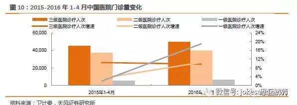 2016年1-4月一級醫(yī)院數(shù)量激增,同比2015年增長24%,而2015年同比增長9%。醫(yī)院數(shù)量不代表病人流向,但是作為標桿數(shù)據(jù),可一定程度上表明政府的資金投入流向。而門診量則是分級診療成效的重要參考數(shù)據(jù)。