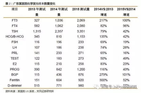廣東省某基層醫(yī)院,一級甲等,2014年檢驗科收入約為1000萬。2013年開始使用國產(chǎn)全自動發(fā)光儀,開展項目主要為甲功、激素兩個套餐。2015-2013年樣本增量變化如下。
