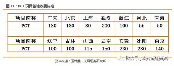 按照購買力平價,PCT項目在中國收費為50比較合理。最早進口品牌進入中國,一般先進入經(jīng)濟相對發(fā)達,人口密集的大省,因此最早的價格多在150-200之間。2014年上海的PCT價格為100,今年已經(jīng)降為80,未來依然存在降價的趨勢,并且會各個城市都會持續(xù)下調(diào)收費。