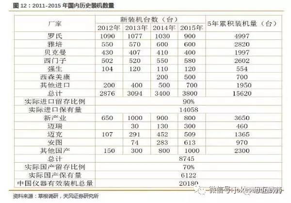 根據(jù)以上邏輯,我們大致可以測算目前的存量市場,發(fā)光還未完全滿足終端需求,2015年儀器保有量來看,只滿足了60%的需求。而未來需求端的增長依然保持極高的增速,除了進口企業(yè),少量國產(chǎn)優(yōu)秀品牌可以分享藍海市場,儀器裝機依然有很大的空間待開發(fā)。