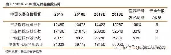根據(jù)醫(yī)院的空缺卡位計算國內(nèi)實際發(fā)光儀器的裝機空間,如上一章節(jié)所分析,2016年由于分級診療前所未有的力度,導致醫(yī)院結(jié)構(gòu)和門診量正在發(fā)生變化,2016年是醫(yī)院結(jié)構(gòu)變化的節(jié)點,未來3年內(nèi)會保持該趨勢。合理給出醫(yī)院數(shù)量的增長,調(diào)研得出醫(yī)院通常采購發(fā)光儀器的臺數(shù)和醫(yī)院開展發(fā)光的比例,可以測算未來三年化學發(fā)光儀器的臺數(shù)空間。