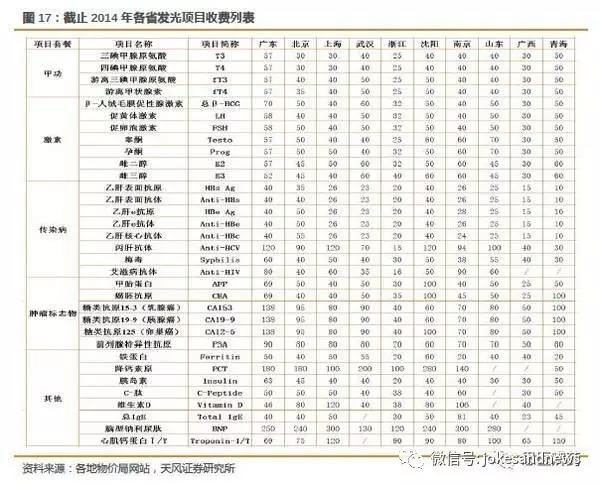 中國各個省的收費標準差異較大,北京是以進口和國產(chǎn)來區(qū)分,有些地方是按照醫(yī)院級別來區(qū)分價格,江浙幾乎不區(qū)分方法學,大部分區(qū)域是分方法學收費,如下圖所示。最大收費標準差異有接近10倍差異,但整體趨勢是類似的。即腫瘤相對價格高,傳染病價格相對較低,甲功和激素位于中位,另外一些不太普及的項目,比如骨代謝、維生素等等,價格起伏較大。