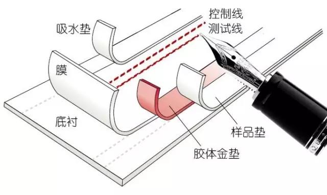 圖2所示是免疫層析產(chǎn)品的生產(chǎn)過程。首先在大張層析膜上噴畫控制線和檢測線,然后把此大張層析膜粘貼在支撐底襯上。這個過程必須要確保底襯和膜的接觸緊密、均勻一直,否則將會導致不同測試條(卡)之間的液體流動速度和方式有很大的不同。下一步是粘貼膠體金墊、樣品墊和吸水墊。吸水墊和膠體金墊各自和硝酸纖維膜有部分交疊,樣品墊覆蓋了膠體金墊的一部分。這里面最需要注意的是各層之間的交疊、接觸需要密切、均勻,不能在任何膜層表面引入物理變形、污染物、或者化學雜質(zhì)。很多和液體流動均勻性有關的問題都和以上這幾個過程有關。最后一步是在溫度和濕度都受控的房間里,把上面制作的大張材料切割成一條條的試紙條,組裝入塑料殼。