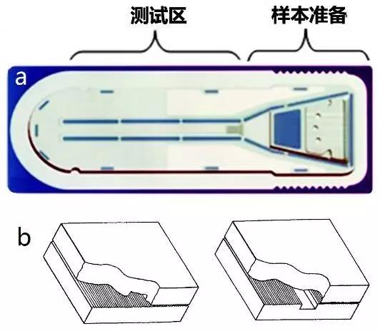 圖3所示是美國Alere公司旗下的Triage產(chǎn)品系列的測試卡結構,其中沒有任何的薄膜材料。它有上下兩層材料組成,兩層材料之間的距離是可以產(chǎn)生毛細現(xiàn)象的距離。上層為高度透明材料,目的是可以使在兩層材料之間產(chǎn)生的熒光信號不受干擾地傳播到透明材料另一側的熒光檢測器件上。底層表面的地貌隨需求變化而不同,而最突出的特征就是“搓衣板”地貌。這樣一個“搓衣板”地貌可以有效的增加表面積、增加抗體固定量及固定強度。在測試區(qū)域的表面上修飾的主要是捕捉抗體和封閉試劑,在樣本準備區(qū)域的不同部位上修飾有熒光標記物、檢測抗體、緩沖試劑、封閉試劑等。樣本進入測試卡以后,其中液體溶解各種生化試劑,毛細作用推動試劑向檢測區(qū)流動。