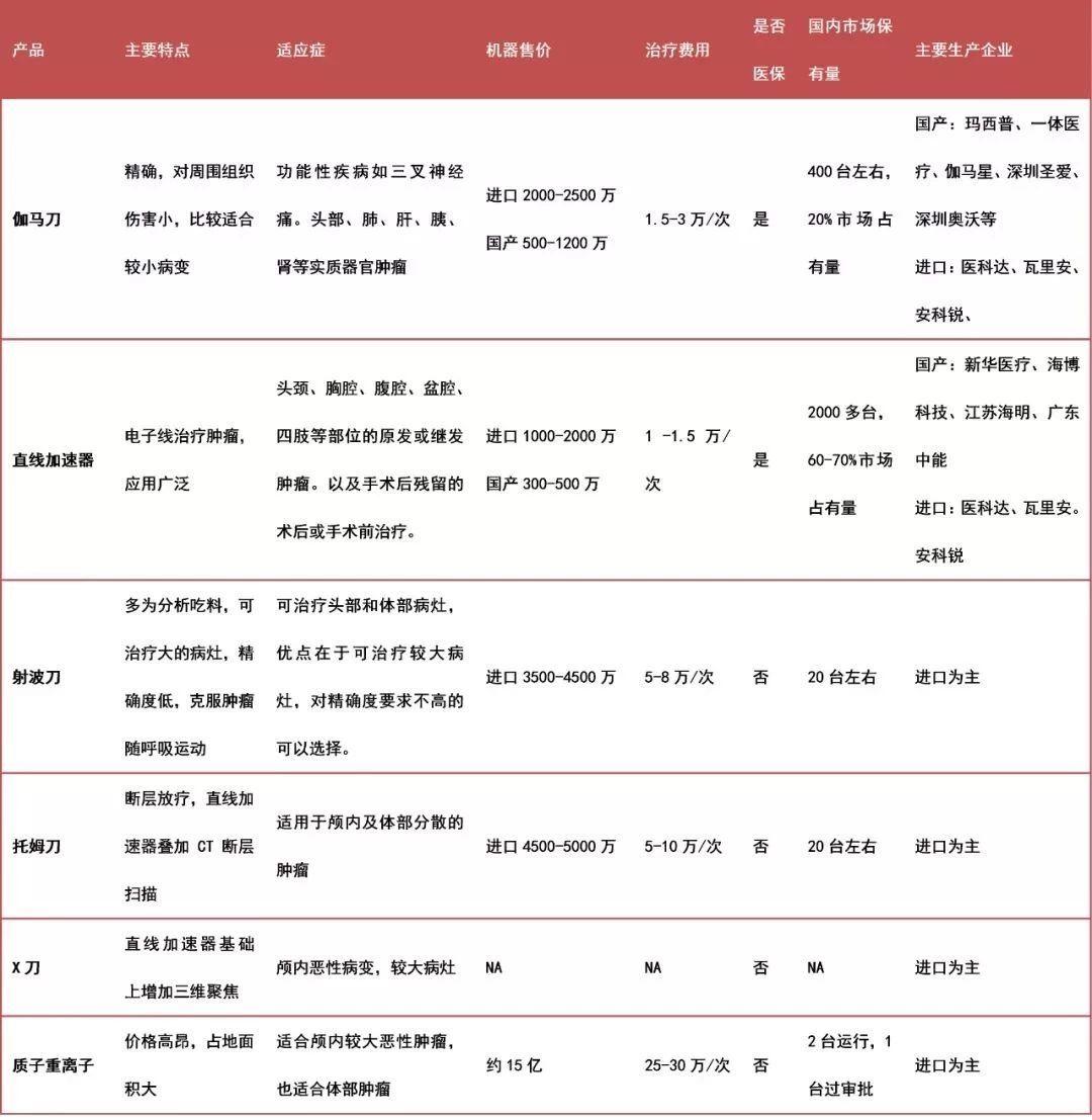 目前的放射治療技術(shù)包括伽瑪?shù)?、射波刀、托姆刀、質(zhì)子重離子、EDGE(速鋒刀)無創(chuàng)手術(shù)系統(tǒng)。各技術(shù)的特點如下。