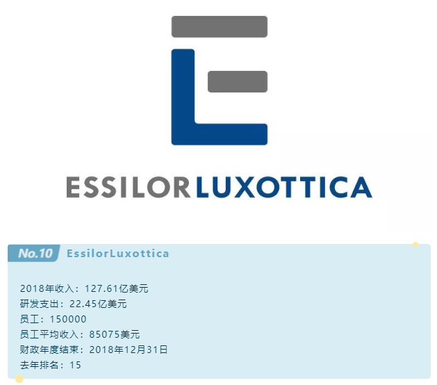 EssilorLuxottica于去年10月與法國鏡片專家Essilor和意大利眼鏡制造商Luxottica合并后成立,以540億歐元的價格成為全球最大的眼鏡制造商。通過并購從全球醫(yī)療器械企業(yè)第15位一舉躍進十強席位。