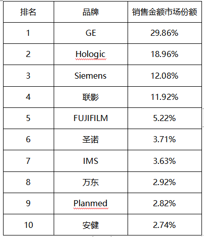 不論從銷售金額和銷售數(shù)量來看,GE 和Hologic都名列前茅,可見產(chǎn)品性能深受大家喜歡,銷售數(shù)量排名第三的聯(lián)影,在銷售額上略偏后于飛利浦。