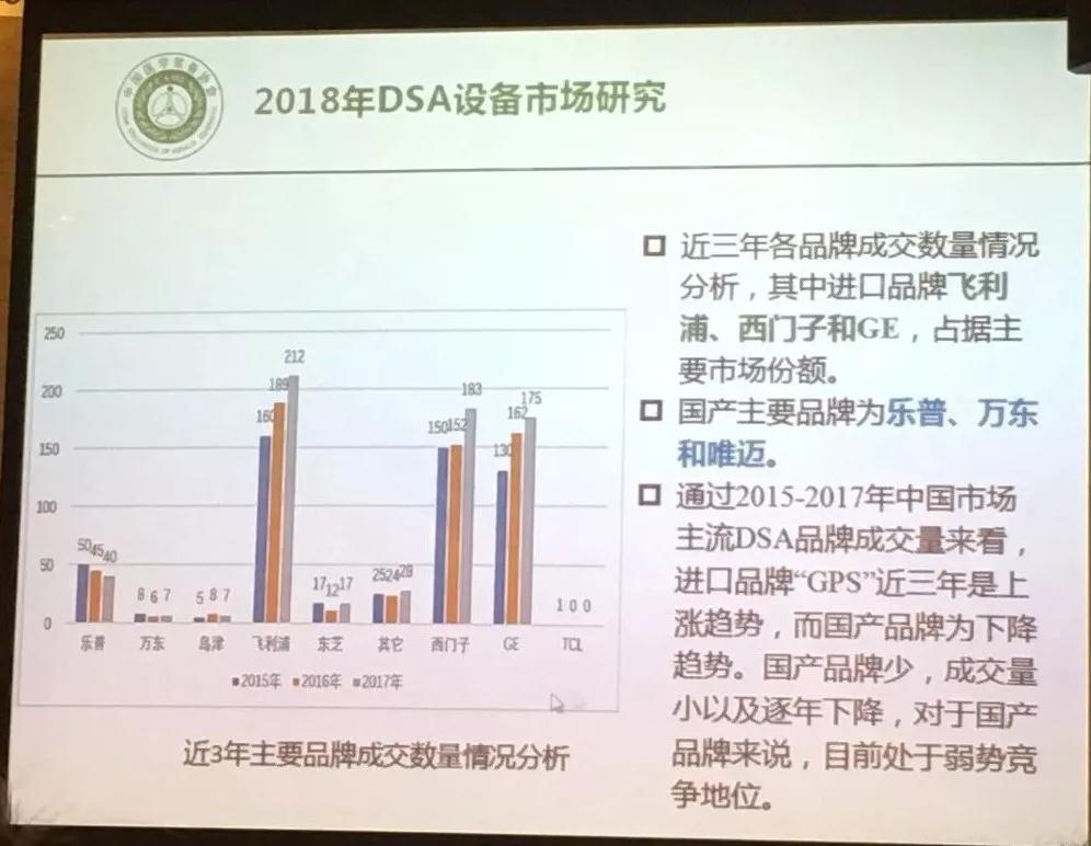 根據(jù)近3年主要品牌成交數(shù)量情況分析,目前國內(nèi)DSA市場主要為飛利浦、西門子和GE掌控,“GPS”三家的成交量呈逐年上漲趨勢。國產(chǎn)DSA廠家目前有主要包括樂普、萬東和唯邁,基本處于弱勢,成交量少,并且年銷售量呈下降趨勢。
