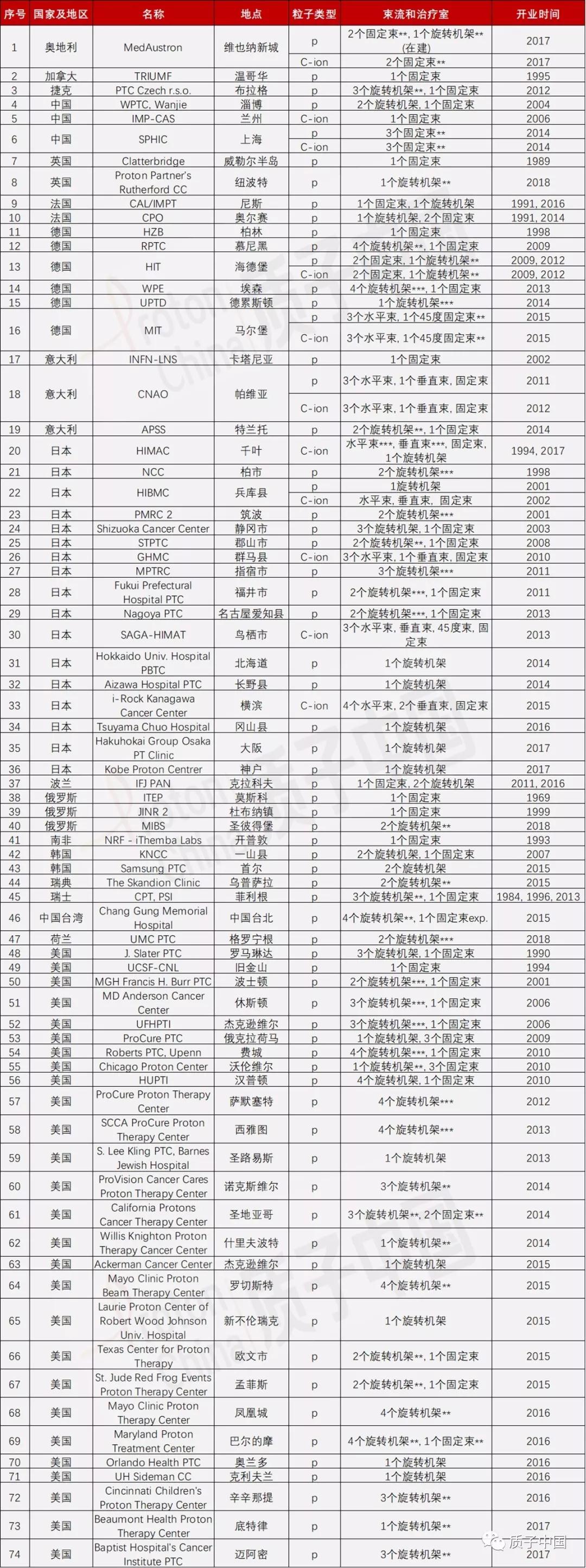 附:全球已運(yùn)營質(zhì)子重離子治療中心匯總表(截至2018年7月)