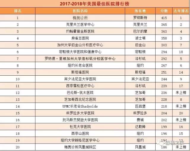 在醫(yī)療界梅奧診所就是傳說(shuō)中的麥加,世界頂尖的醫(yī)療機(jī)構(gòu)。2017年8月8日,《美國(guó)新聞與世界報(bào)道》公布了2017-2018美國(guó)最佳醫(yī)院排行榜,梅奧診所以415分的總分再次榮登榜首,并在糖尿病和內(nèi)分泌專科、胃腸科、婦科、腎臟科、神經(jīng)??坪屠夏瓴W(xué)六個(gè)??浦信琶谝?。