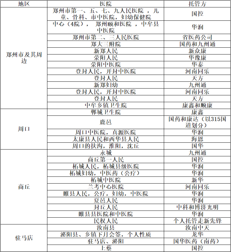 事實上,九州通、華潤醫(yī)藥、國藥等藥事巨頭近年來高歌猛進(jìn)的藥房托管已經(jīng)為今天的耗材集采和托管服務(wù)埋下了深厚的伏筆——本質(zhì)是大規(guī)模并購后的醫(yī)藥物流服務(wù)延伸入院的頂層利益格局的滲透。下面是河南省在2015年的藥事(含部分耗材)供應(yīng)托管統(tǒng)計表,有興趣的同仁可以深度了解一下: