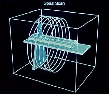 在治療之前,先由KVCT對病人進(jìn)行斷層掃描,根據(jù)此掃描圖像由治療計劃系統(tǒng)進(jìn)行逆向治療計劃設(shè)計,即各個角度束流形狀及流強(qiáng)分布設(shè)計;也既計算出在治療環(huán)每一個旋轉(zhuǎn)角度和治療床前進(jìn)的每一個位置上的多葉準(zhǔn)直器各個葉片的確切位置。然后打開加速器,用MVCT再核準(zhǔn)病灶位置;如有錯位,預(yù)先進(jìn)行調(diào)節(jié);在治療過程中,治療環(huán)旋轉(zhuǎn)和治療床勻速前進(jìn),進(jìn)行螺旋照射,見圖(2)