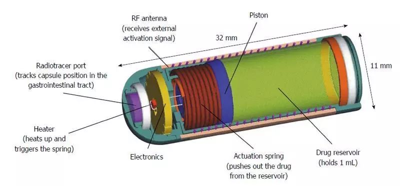 當(dāng)彈簧釋放時(shí),Enterion能夠通過9毫米開口輸送任何類型的藥物配方(包括干粉,半固體,懸浮液或溶液配方),迫使活塞沿著膠囊的軸移動(dòng),從而,清空所述容器到胃腸道的特定位置。將放射性標(biāo)記物放置在單獨(dú)的密封示蹤劑端口內(nèi),以允許使用γ閃爍掃描法實(shí)時(shí)觀察膠囊位置。活塞的運(yùn)動(dòng)還操作開關(guān),該開關(guān)以精確的頻率傳輸弱無線電信號(hào)。這個(gè)信號(hào)的檢測(cè)從外部確認(rèn)膠囊已成功?;钊\(yùn)動(dòng)在膠囊末端附近停止,這保持了密封并防止內(nèi)部電子元件與GI流體接觸。