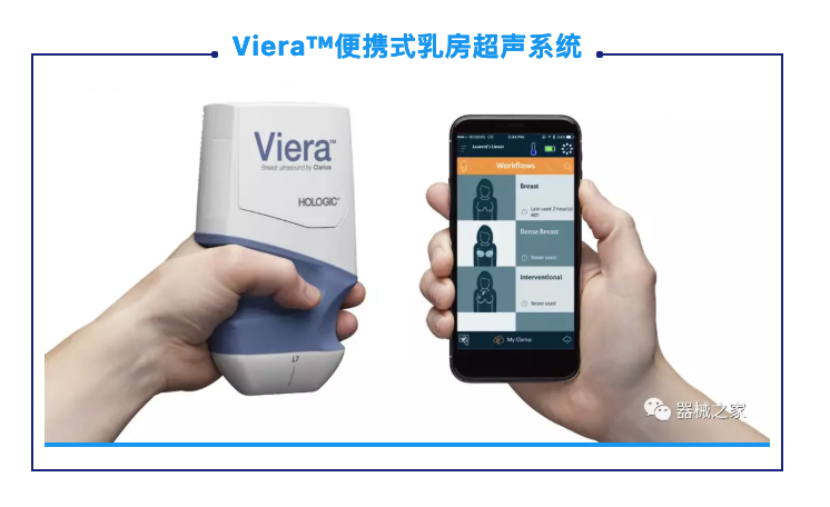 POCUS進(jìn)入乳房成像的另一個例子是2018年Hologic新推出的Viera?便攜式乳房超聲系統(tǒng)。無線超聲掃描儀為醫(yī)生提供了早期診斷和優(yōu)化臨床工作流程的機(jī)會。它可以指導(dǎo)介入程序,如活組織檢查,標(biāo)記放置和電線本地化。它還可以將乳房圖像傳輸?shù)街悄茉O(shè)備或PACS。